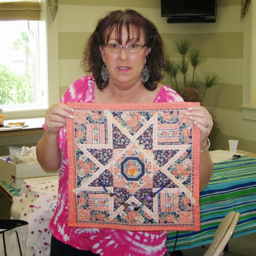 Kathy Jones - shared and donated a fidget quilt she named Pink Elephant. Nothing crazy here, just beautifully pieced, pretty pink fabrics, with a shiny, silky pink elephant center applique. And then Kathy showed us a huge, bed-size antique quilt, probably from 1920's - 1930's judging by fabrics - star design block - all hand pieced, all, every single piece by hand cut and sewn. Kathy is hoping that anyone who has knowledge/experience working with antique pieces/quilts/fabrics will give her information on how to handle these wonderful pieces of history. This is just the finished top that was never completed with batting, backing and binding. Kathy will welcome any comments and suggestions at all. She is hoping to help her friend find out how to restore the quilt.