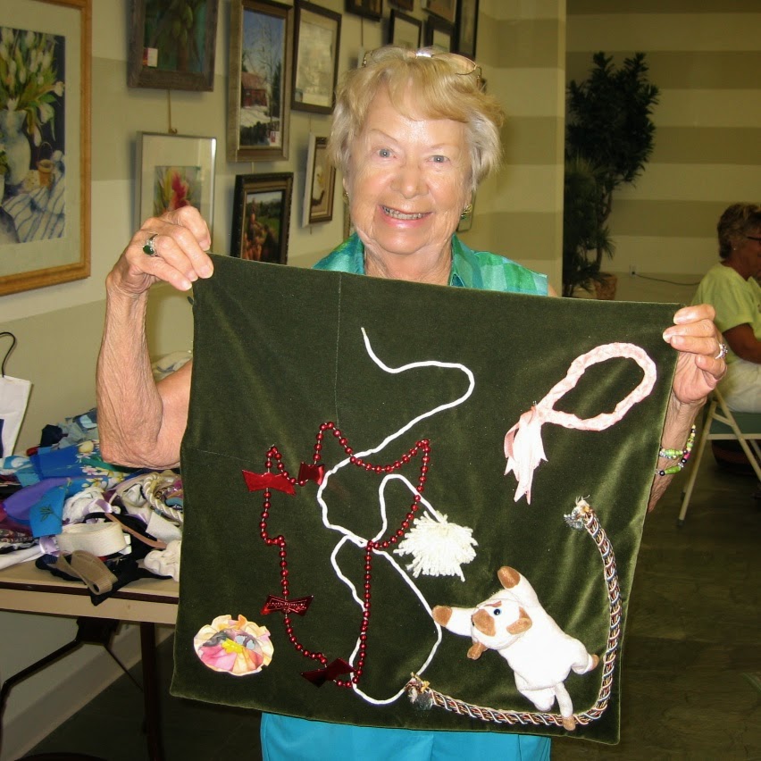 Joyce Snyder showed some hand towels she embellished and a tote bag project she plans to put together for one of our crafting visits to Homewood.